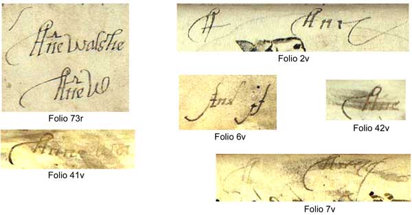"Anne" is some cases written out in full, and other cases abbreviated to "Ane," with or without an abbreviation sign over the single "n". All instances appear to be written by the same hand. The writing on folio 6v at first glance seems to say "And if" or "And it" but could actually be "Ane" and two unrelated letters. It appears to be in the same hand as the other signatures, though the style of the "A" is different. In three cases (folio 7v, 41v and 42v) the writing is smudged, possibly in an attempt to erase an unsatisfactory effort, and on folio 7v the writing ends in a scribble. The impression the writing gives is of Anne practicing her signature.