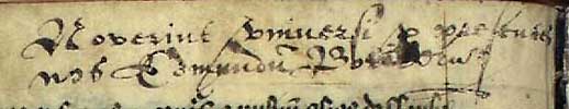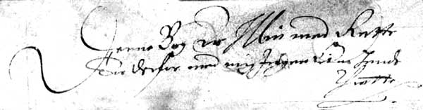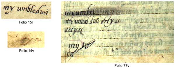 On three folia, in the same hand, is the phrase (or part of the phrase) "my umble duti" (Figure 2). On folio 14v only "my u" appears, with the "m" partly smudged. On folio 15r is "my umble duti" in dark, firm strokes. Folio 77v shows several attempts to write the phrase, this time with the second word spelled "umbel". This is the last folio in the manuscript, and has several unused text guidelines at the bottom; Anne clearly thought this was a wonderful place to practice her writing.