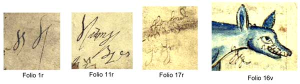 Anne has scribbled on several other pages in the manuscript (Figure 3). While a few of the scribbles may contain words, most are simple loops and doodles of the sort someone testing a pen point might do. The scribbles are generally in the same style and type of ink as Anne's signature, though at least one (folio 11r) may be in a different hand. The scribbles appear in the margins and also in the illustrations (eg: folio 16v, where Anne has embellished the beast's teeth).