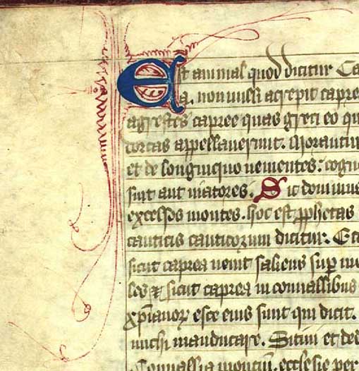 Each section of the text, generally corresponding to the description of a single beast, has an ornate initial in red and blue (Figure 7). Most initials are decorated with fine red-line flourishes that often occupy most of the vertical margin. Some folia have smaller initials in blue or red only, with no flourishes, marking the start of paragraphs within a beast section.