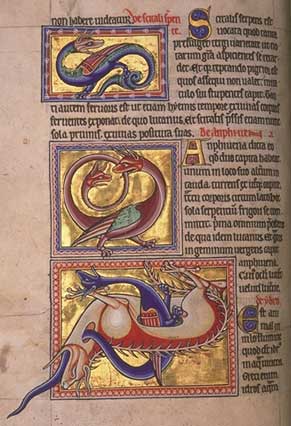 Anne's bestiary has images on most pages, up to folio 65, after which there are no more illustrations. The subjects of the chapters in the final pages (trees, the nature of man) are not usually illustrated in most bestiaries, though the subject of the last folio of the Walshe bestiary, the "lapides igniferi" (fiery stones), often is. Some subjects traditionally were illustrated with full-page or nearly full-page images, and the Walshe manuscript follows this tradition with full-page illustrations of Adam naming the animals (folio 21v) and the Cinnomolgus tree (folio 38v). Two other beasts that are traditionally given full-page illustrations are given almost full pages here; these are the Peridexion tree, doves and dragon (folio 49r); and the elephant and castle (folio 6v). Several illustrations are half-page or larger. Some pages have three images; this is a common feature in bestiary pages that describe snakes (Figure 12/Figure 13).