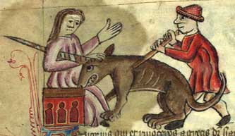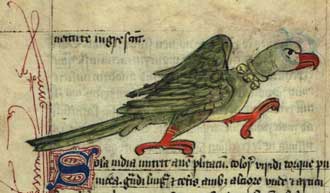 The drawings in Anne's bestiary have a decidedly whimsical air to them. The artist seems to have had a sense of humor. The parrot, who the text says needs to be hit over the head with an iron bar to get his attention, looks suitably angry (Figure 16); the bonnacon (Figure 14) looks smug at his successful defense; the fox has handily tossed his stolen goose across his shoulders (Figure 9); and the girl who has just betrayed the unicorn seems to show remorse (Figure 17).