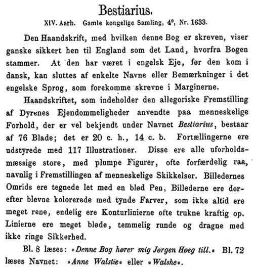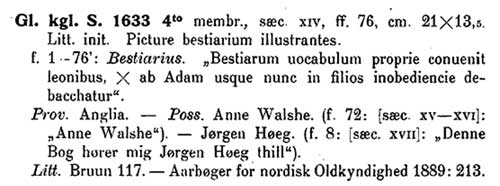 David Badke: I am interested in one of the two bestiary manuscripts at the Kongelige Bibliotek, Copenhagen KB GkS 1633 4˚ (the Bestiarius of Anne Walshe). During my search for information on this manuscript I found your most useful CHD Guide and Web site. I have also seen the short article by Chr. Bruun (from De illuminerede Haandskrifter fra Middelalderen i Det store kgl. Bibliothek) on the Kongelige Bibliotek Web site, which appears to be all that has been written about the manuscript - at least that article, as well as your Guide, is all I have been able to find so far, except for the occasional inclusion of the manuscript in lists of surviving bestiaries. Unfortunately for me, the Bruun text is in Danish, which I cannot read and have not found anyone here to translate for me. Do you have, or can you provide, a translation into English for me? Do you perhaps have other codicological or historical information on the manuscript, or know where I can obtain such information?