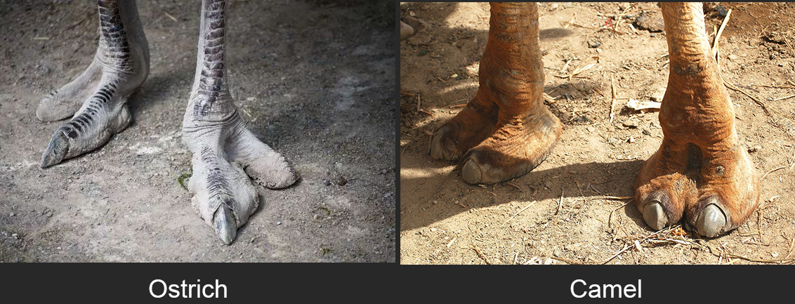 African ostrich feet do resemble camel feet. Ostrich feet have two separate toes, one larger than the other, with a nail at the end of the larger one. Camel feet also have two toes, both approximately the same size, each with a nail at the end.
