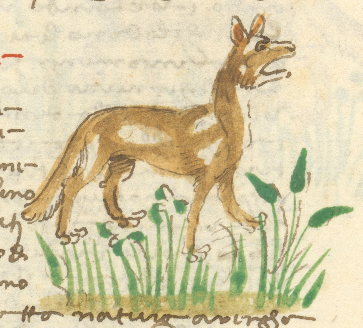 Volpe è bestia molto fraudolente et ingannevele, che infingendose si como fuosse morta, tenendo la lengua fore de la gola e nullo fiato rendendo, et allora l'uccegli che beccha carogna, credendo che sia morta, vae allei a beccharglie la lengua e tutto l'altro corpo, et ella tanto la soffere che di questi ucceli prendeno; et sì come dice fiziolaco, rende loro pegio con denti che loro non fa allei col beccho. Et naturalmente non va diritta per via, ma sempre cioppicando, però che à le gambe diritte più corte che le sinestre. Alcuna volta, quando è appresiata dai cani, leva la sua coda e li cani la prende, e remane la boccha del cani piena de pele, per la quale cagione alcuna volta scampa. Naturalmente se porta grande odio con uno animale che à nome tasso, e questo aviene per cagione de le loro tane; e per tale engegno enganna la volpe lo tasso e tolleglie la sua tana, cioè che ella glie soça la sua tana collo suo sterco e colla sua urina, la quale si è molto puççulente, e per tal modo la toglie la volpe al tasso, però che ll'abandona. Anchora usa ella grandissima malitia fugendo dai cani; cioè quando ella vede bene ch'ella non può scampare, e questo si è ultimo suo remedio, che ella se mette la coda entra le gambe et urinavi sue e tra' questa coda co l' urina e si dà sopra la testa al cane che la vole prendere, et allora el cane per la grande puçça de l' urina lassa la sua caccia e per cotale modo assai volte scampano le decte volpe.