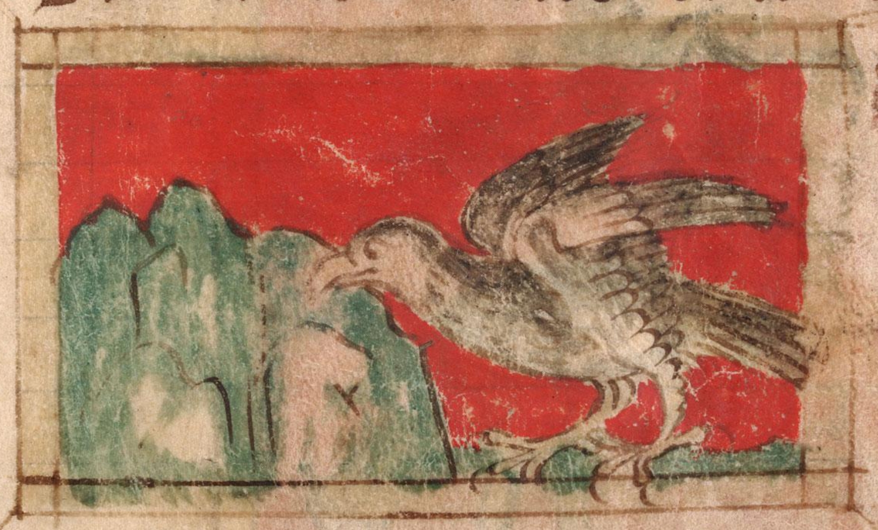 Li aigles prent ses poucins par ses ongles. Et celui qui se tient fermement aimme et le retient avoec lui. Et celui qui se tient foiblement laisse aler et ne s’en prent garde. Quant ele est vieille, si vole si haut qu’ele passe les nues en haut. Et tient tant sa veüe el souleill que ele l’a toute pardue et arse, et que ses pennes sont toutes brullées. Et lors chiet aval tout en ·i· mont en une eave que ele a avant choisie. Et ainsi a sa vie renouvelée. Et quant sont bec est trop lonc, si le brise a une dure pierre et le raguise.