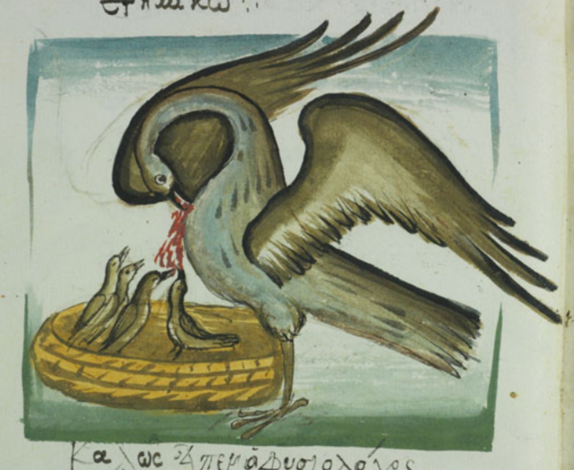 David says in Psalm 101, "I am like the pelican in loneliness" [Ps. 102: 7]. Physiologus says of the pelican that it is an exceeding lover of its young. If the pelican brings forth young and the little ones grow, they take to striking their parents in the face. The parents, however, hitting back kill their young ones and then, moved by compassion, they weep over them for three days, lamenting over those whom they killed. On the third day, their mother strikes her side and spills her own blood over their dead bodies (that is, of the chicks) and the blood itself awakens them from death. Thus did our Lord speaking through Isaiah say, "I have brought forth sons and have lifted them up, but they have scorned me" [Is. 1: 2]. The Maker of every creature brought us forth and we struck him. How did we strike him? Because we served the creature rather than the creator [cf. Rom. 1: 25]. The Lord ascended the height of the cross and the impious ones struck his side and opened it and blood and water came forth for eternal life [cf. John 19: 34 and 6: 55], blood because it is said, "Taking the chalice he gave .thanks" [Matt. 26: 27 and Lk. 22:17], and water because of the baptism of repentance [Mk. 1: 4 and Lk. 3: 3]. The Lord said, "They have forsaken me, the fountain of living water," and so on [Jer. 2:13]. Physiologus, therefore, spoke well of the pelican.