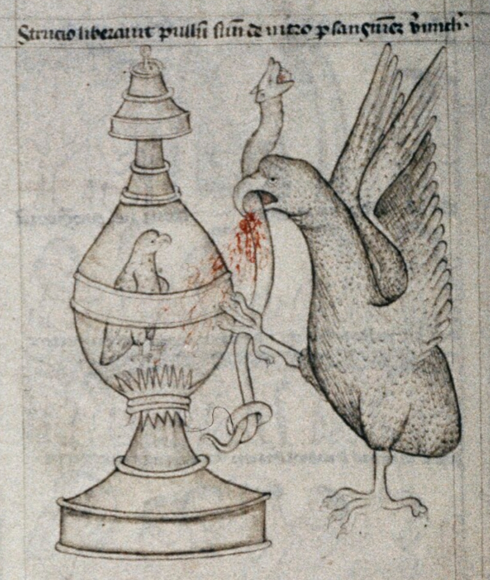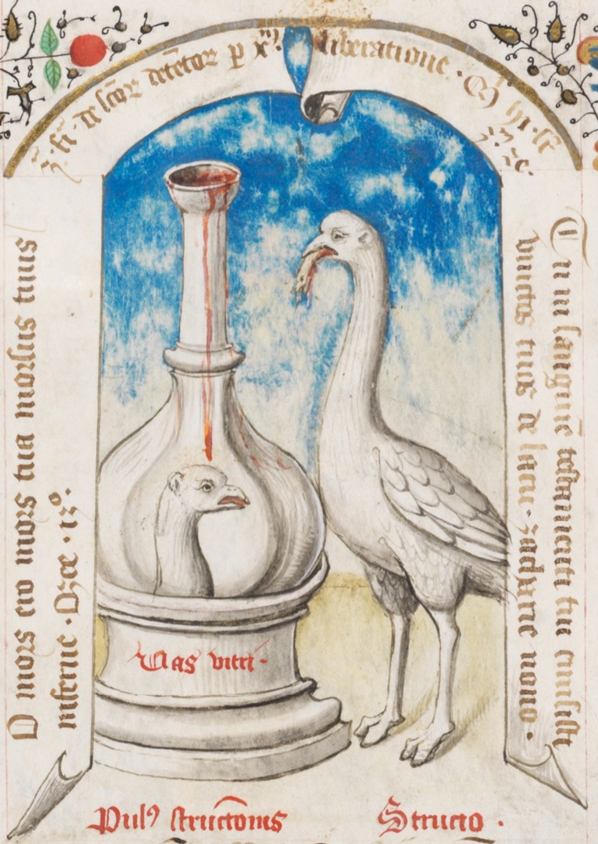 And although hell was fortified with many weapons and demons, / But Christ easily broke it with his blood. / This had once been foreshadowed in Solomon's ostrich, / Whose chick King Solomon enclosed in a glass vessel; / The ostrich, desiring to free its chick from confinement, / Went into the desert and brought from there a certain worm, / Which, compressed, squeezed out blood upon the glass, / And at the touch of it the glass split in half: / Thus when the blood of Christ was shed on the cross, / Hell was broken as glass, and man went forth free.